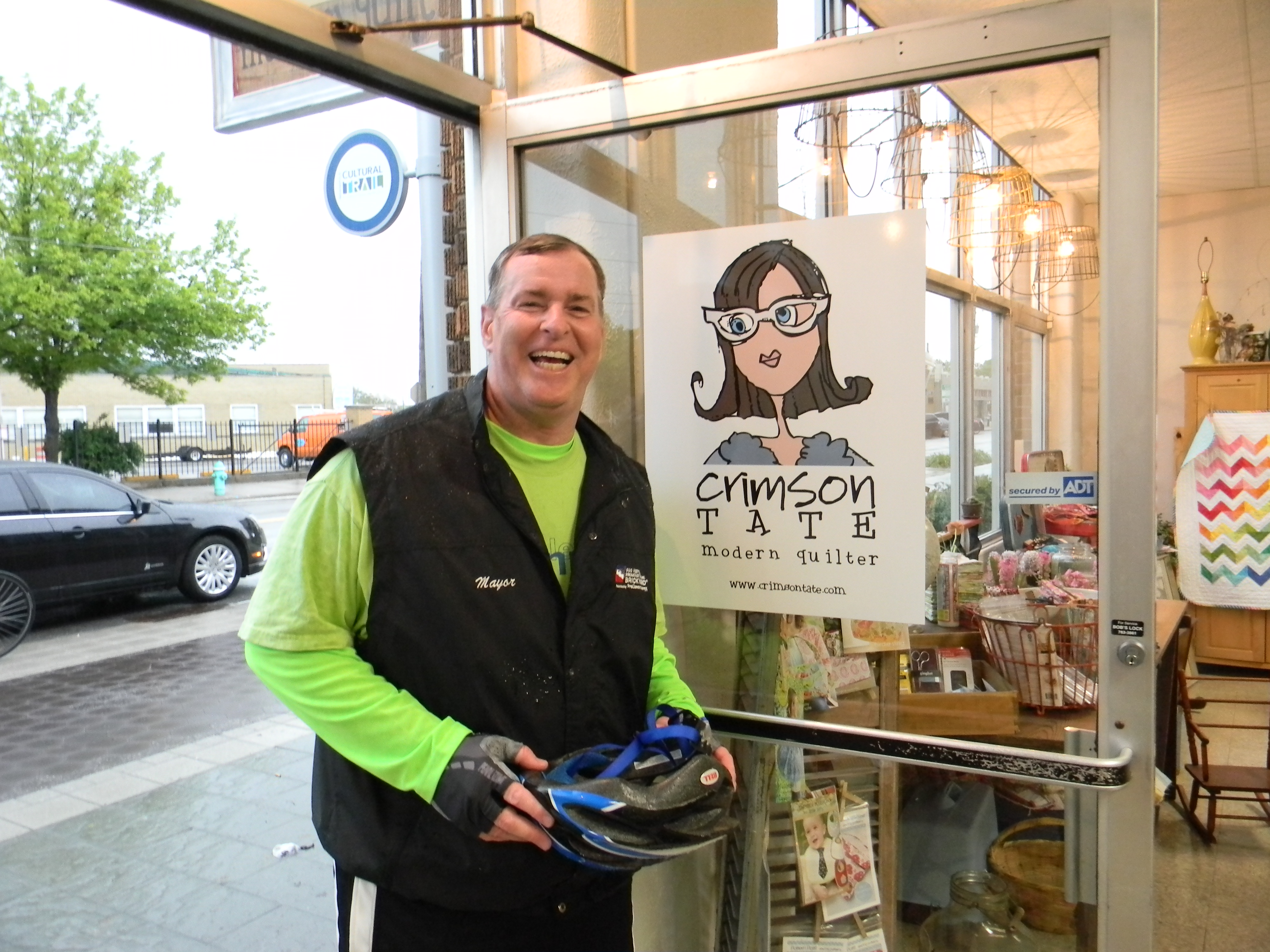 Being on the Cultural Trail in Downtown Indianapolis along Mass Ave is GREAT! We are constantly entertaining cyclists on century rides, runners training for the Indianapolis Mini-Marathon, and babies in strollers who prefer to be pushed along the brick path laid by the city of Indianapolis. On Saturday morning during Camp Sew and Sew, Crimson Tate’s sewing club for kids, we spotted Mayor Greg Ballard as he hopped on his bike to take the Cultural Trail north to the Monon. From the 800 block of Mass Ave, it’s a simple jaunt to 10th Street and away you go. Thanks Mayor Ballard for entertaining us by posing with Crimson Tate’s sign after your bike ride. He looks good, don’t you think, considering he had just returned from a long bike ride along the best Cultural District in the city, Mass Ave. Perhaps his next adventure, a quilting class at Crimson Tate?!? Come on in!!!