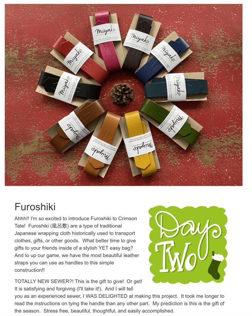 I already know you’re going to love this.  You’re going to love making and gifting this.  So, as a part of the 12 Days of Holidays at Crimson Tate, when you purchase three bag handles and the pattern booklet, you’ll recevie 10% off the Miayko bag supplies.Please note!  The pattern booklet is written with centimeters as the measurments.  So if that is gonna make you mad, I advise not purchasing it!  It was helpful me me to look at the images but it, too is very simple.  It helped me understand how to work.  And I googled how big 110 CM is.  Does anyone know without googling it?!  It’s 43″.  So, a 1-1/4 yard is an efficient measurement to make these bags.Please also note, the discount code FUROSHIKI will reduce the price of Miyako bag supplies only.