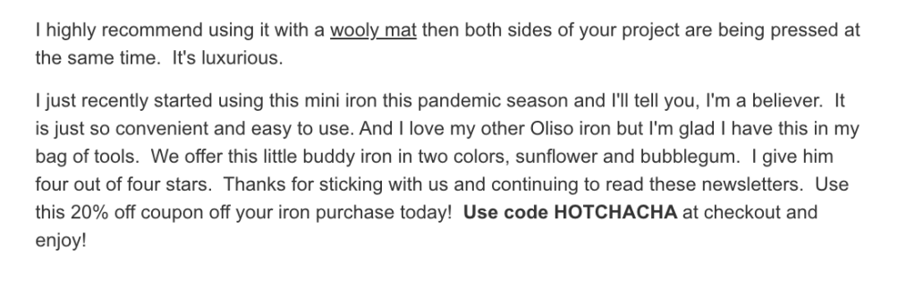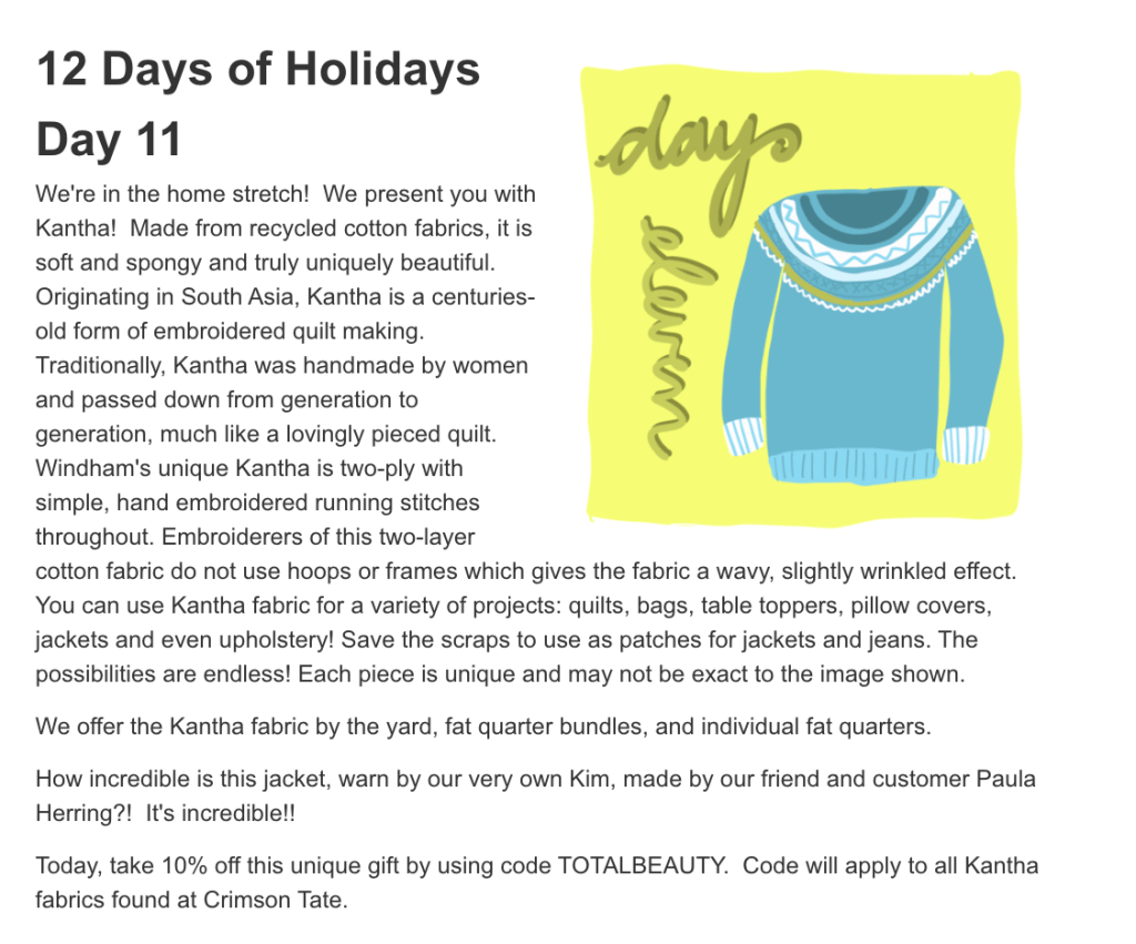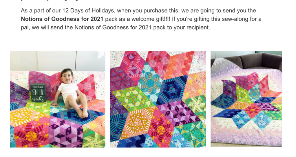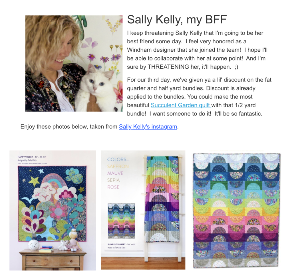 I’m setting us all up for a slam dunk on Day One!  FreeSpirit Solids are boss.  In a heafty range that coordinate beautifully with FreeSpirit designer fabrics such as Tula Pink, Kaffe Fasset, and Anna Maria Horner, these solids have been our go-to for YEARS!  For the first time ever, we are offering the current color card showcasing 80 beautiful swatches of fabric in all the vibrant colors FreeSpirit offers.  Included in the card are the signature Tula Pink solids as well as FreeSpirit Essential solids so you can make decisions concerning your next project at home! Thanks for entertaining me and for being entertained.  I wanna kick off the first day with a coupon of fun.  Take 15% off FreeSpirit Solids with the code TOOTLES in honor of Gertrude’s 15th birthday.  I’m giggling as I write.  That is the silliest thing but yet again, I love it.