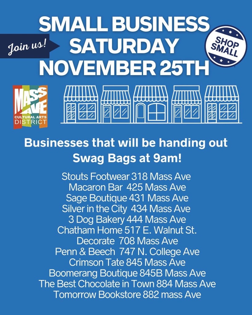 At 9:00 AM our doors will open on Small Business Saturday where we’ll be giving away 10 swag bags filled with goods from our other local business friends including our longtime bestie Silver in the City, Decorate Indy, and Boomerang BTQ. We are also excited about our new friends and local bookshop Tomorrow Bookstore and chocolatier The Best Chocolate in Town who both have opened their storefronts on the Ave in our block!!! And more!!! We’re excited about all the fun contained in these swag bags!!!