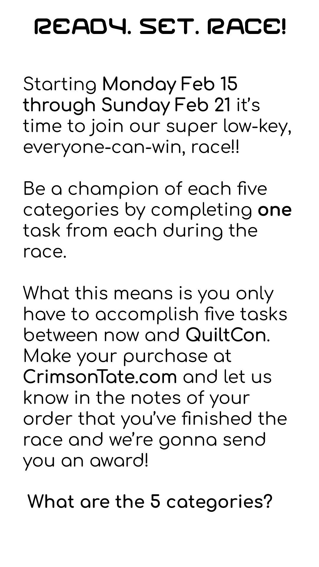 This year we’re doing it again!!! We are including a philanthropic opportunity to support our buddies at Indiana Comfort Quilts. Crimson Tate will give you multiple opportunities to win stuff. Win-win-win, right?!